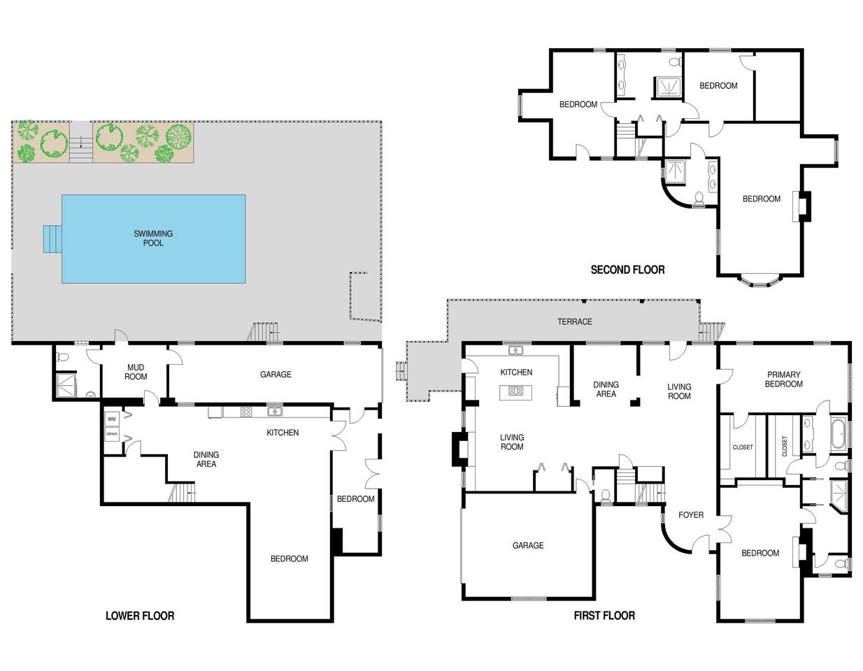 * Fully equipped kitchen, open-concept family room, and formal dining area.