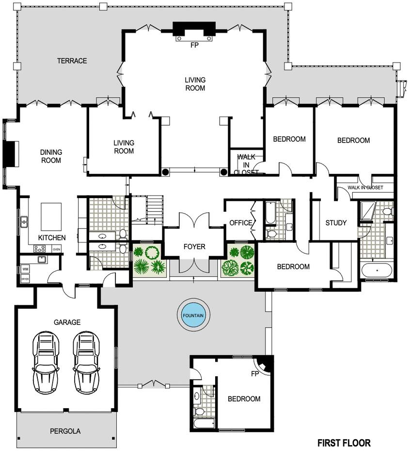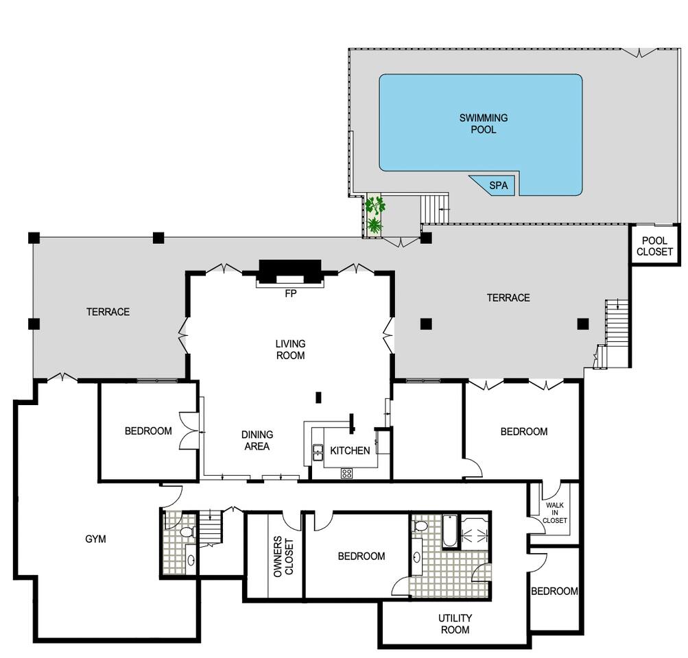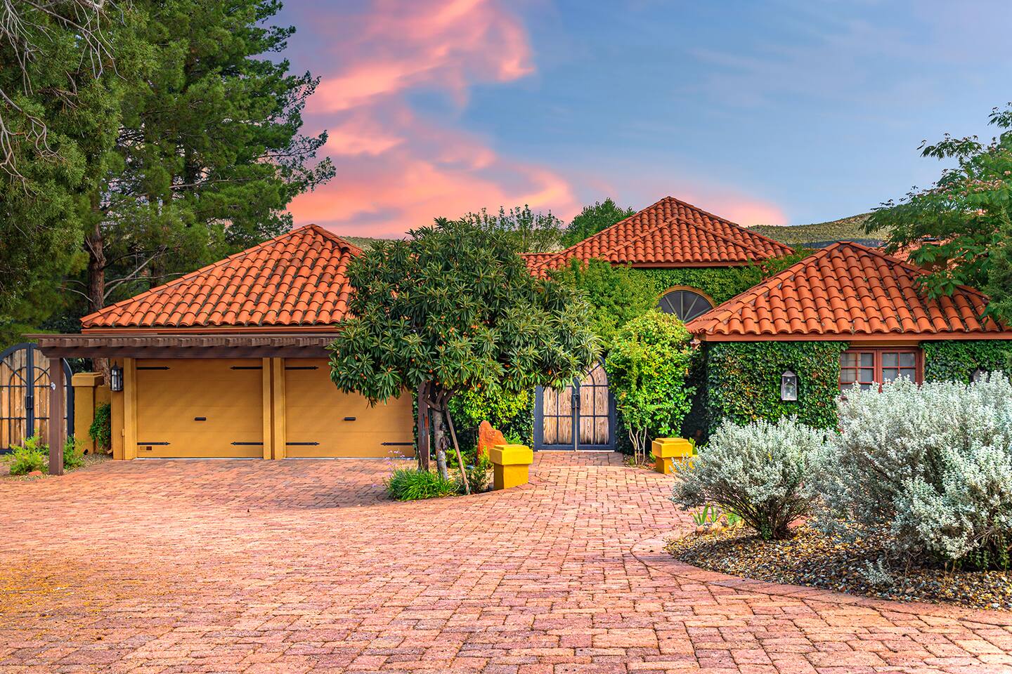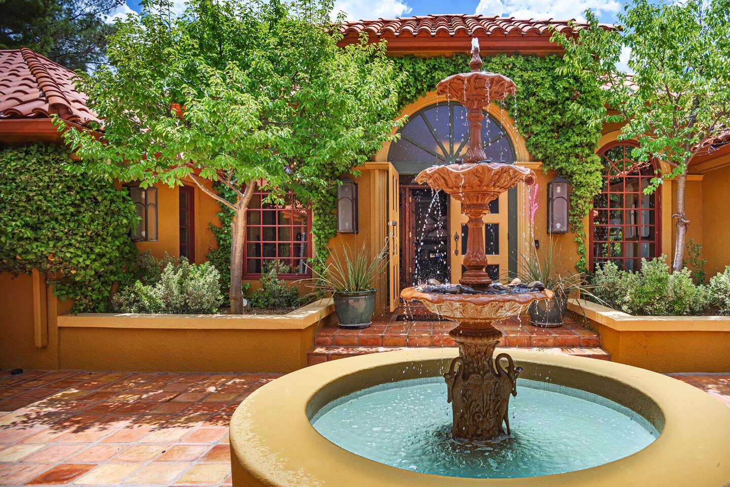 Spanning 7,100 square feet, this expansive property includes a 7-bedroom main home and a separate 1-bedroom guest house, comfortably accommodating up to 22 guests. The ivy-covered estate features an arched, gated entrance leading to a terra cotta courtyard.